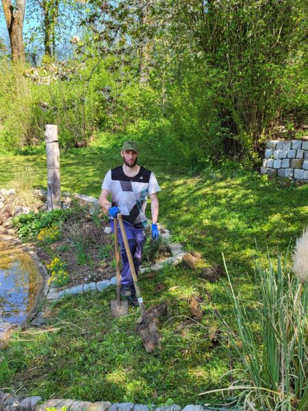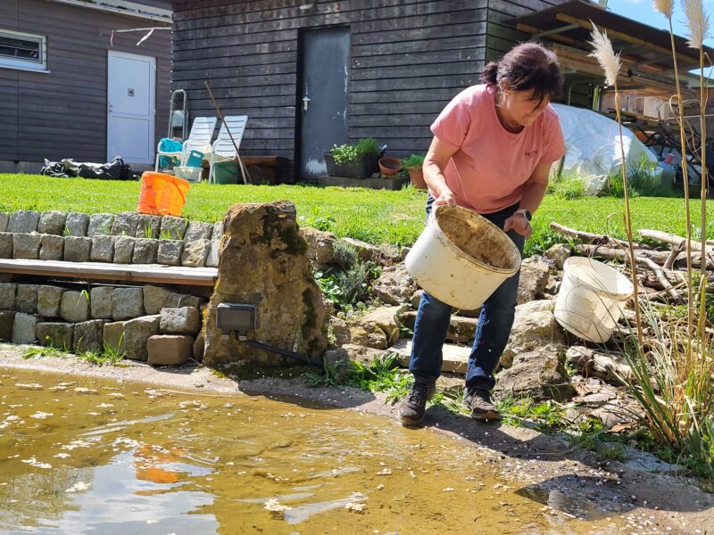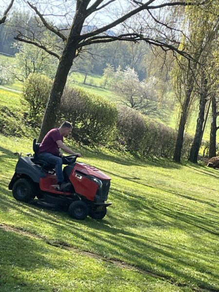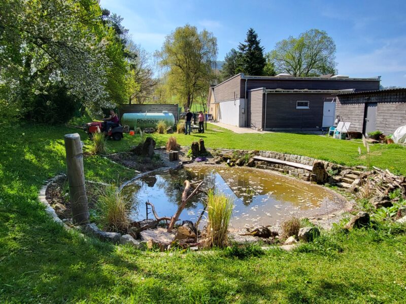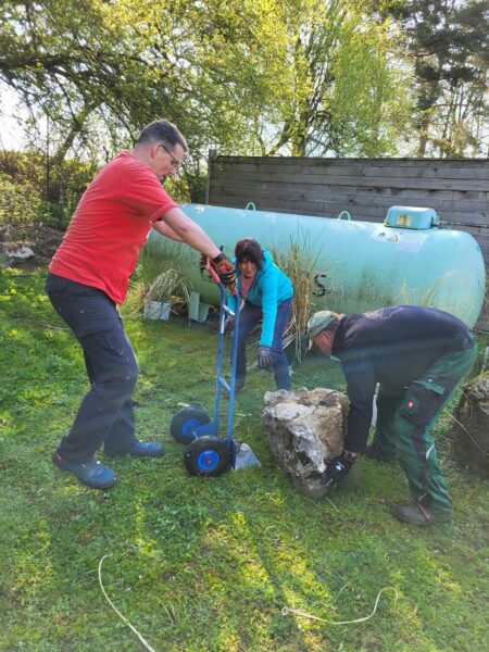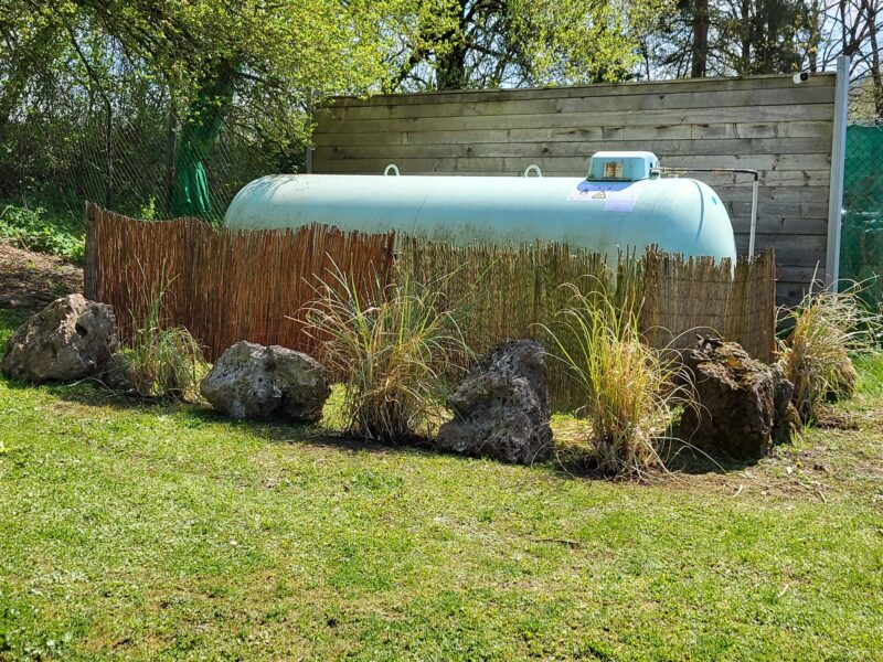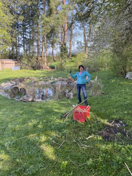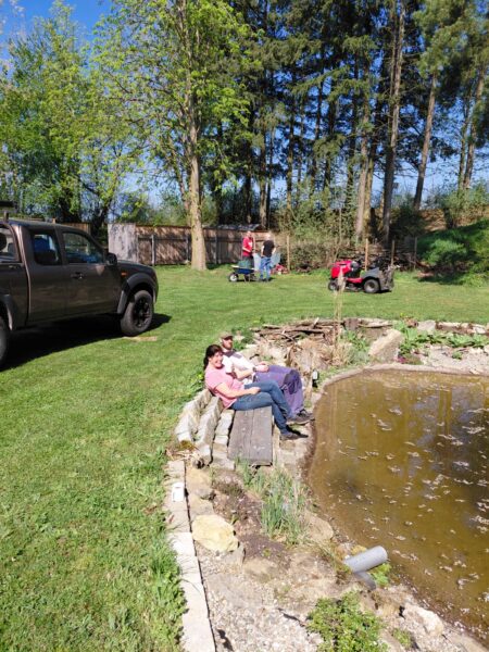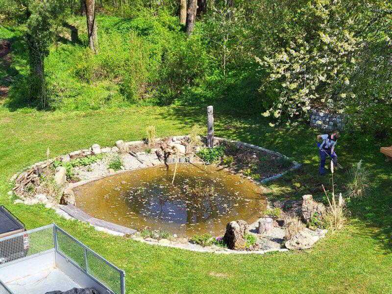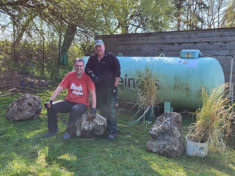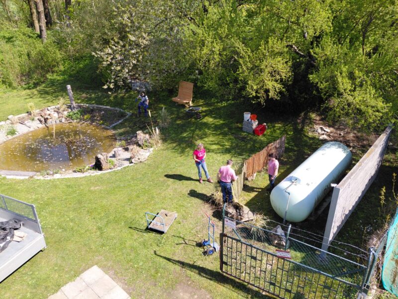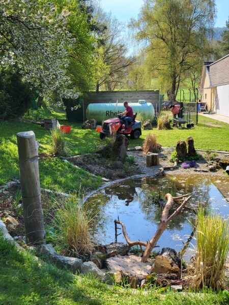 Die Wiese ist gemäht. Die Einfahrt gekehrt. Die Blumenbeete gesäubert und unser Platz rund um den Teich wurde weiter verschönert. Der Gastank hat einen Sichtschutz bekommen.