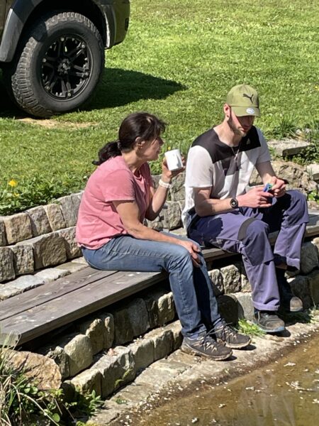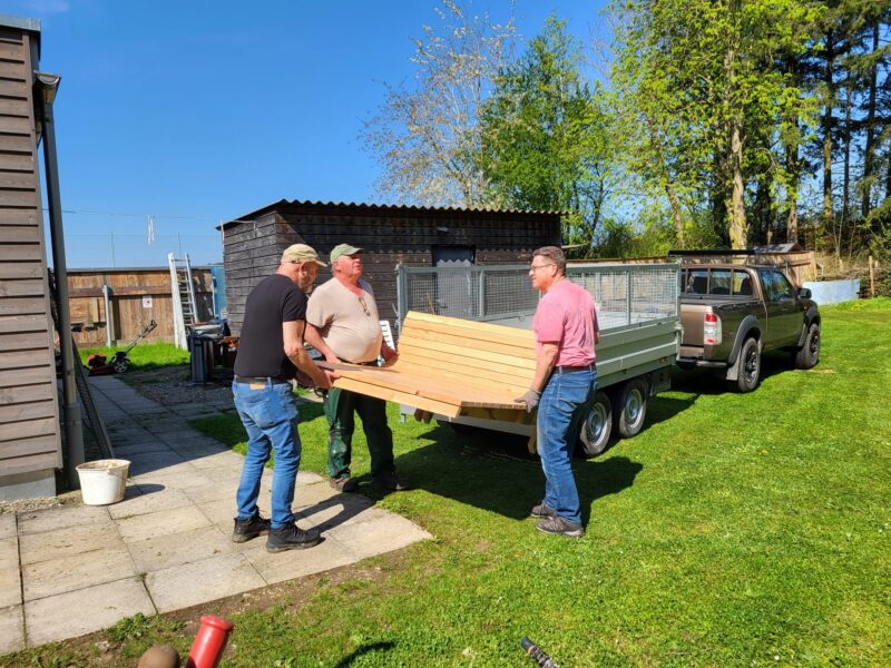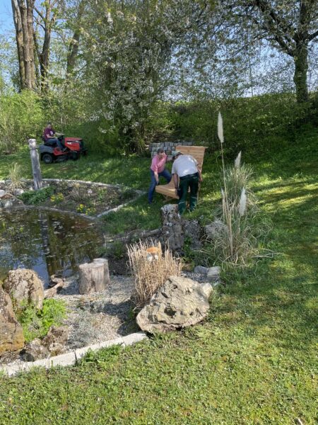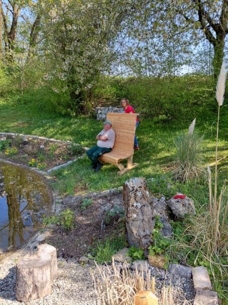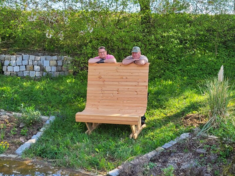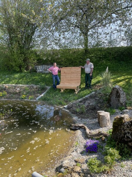 Zwischenzeitlich ist auch die von Michael Dengler selbst gebaute Bank angekommen.